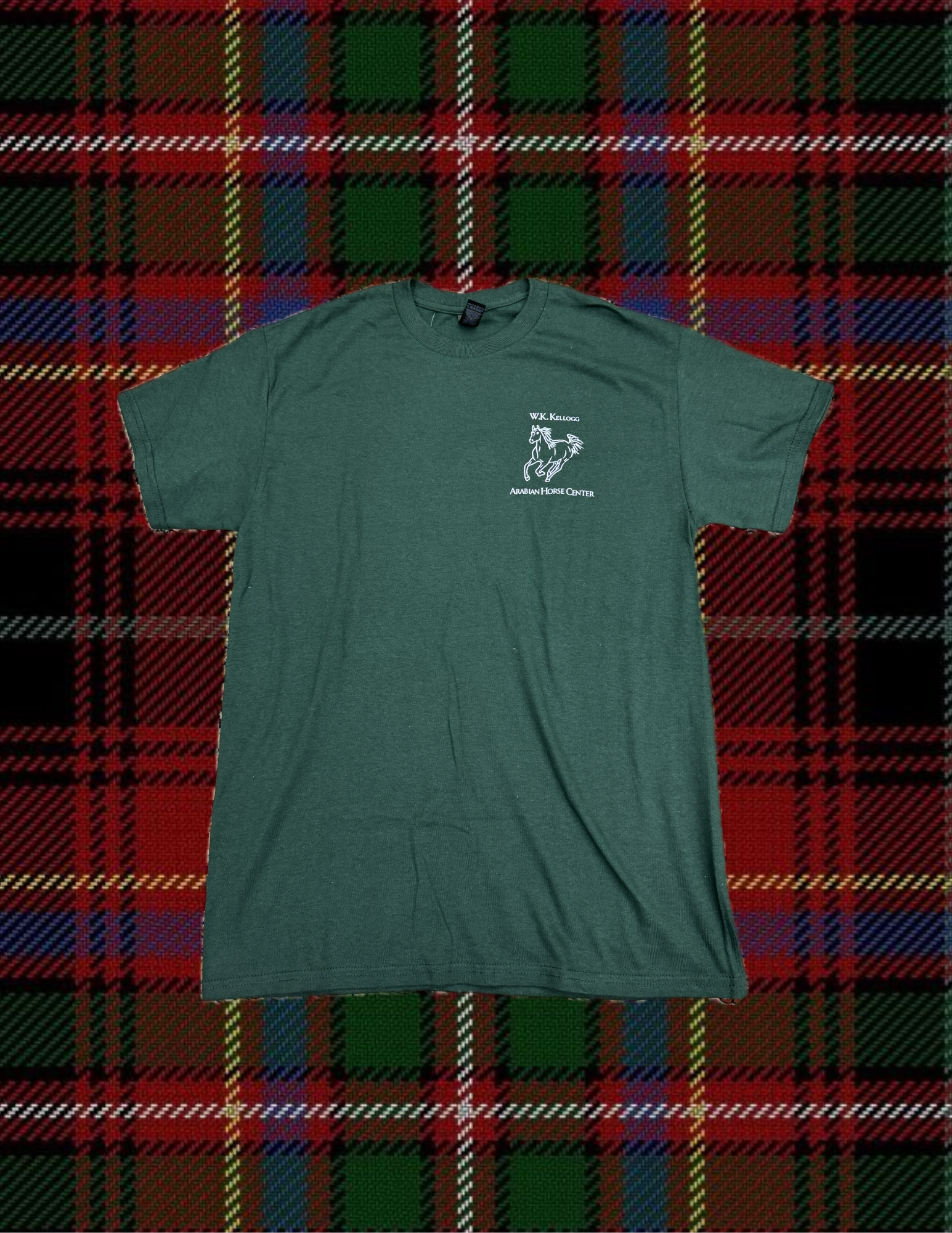 Show your love for equestrian heritage with the W.K.K. Arabian Horse Center Adult Tee! Made from premium dark green fabric, this tee features a sleek white outline of an animated Arabian horse, paired with the elegant script "W.K. Kellogg Arabian Horse Center." A timeless design that celebrates tradition, perfect for casual outings or visits to the iconic center.